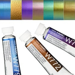 Chroma Shine are shimmering metallic watercolours that gradually change colour when viewed from different angles. Semi-opaque with good covering power and vibrancy regardless of the underlying colour. Can be used on their own or mixed with regular colours.