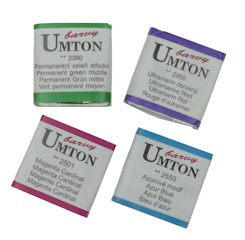 Fine grade pigments and the brightest gum arabic combine to give the Umton watercolours their presence on the paper. There are 59 colours in the range, all of which are lightfast and available in large 2.6ml pans. Umton is a watercolour that has excellent mixing characteristics, good control on the paper and strong honest colour.